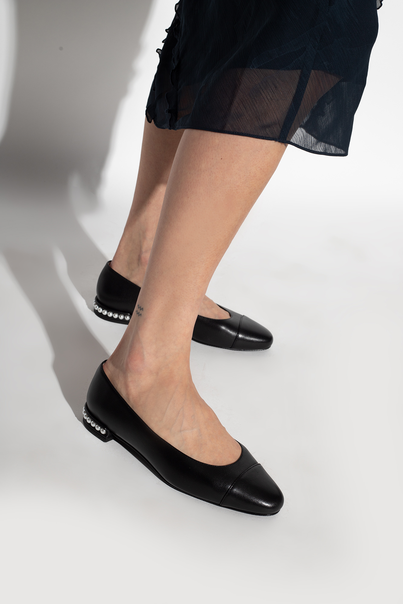 The hallmark of the flats is their captivating pearl embellishments, which lend an air of refined sophistication and attention to detail that elevates the design above the ordinary.